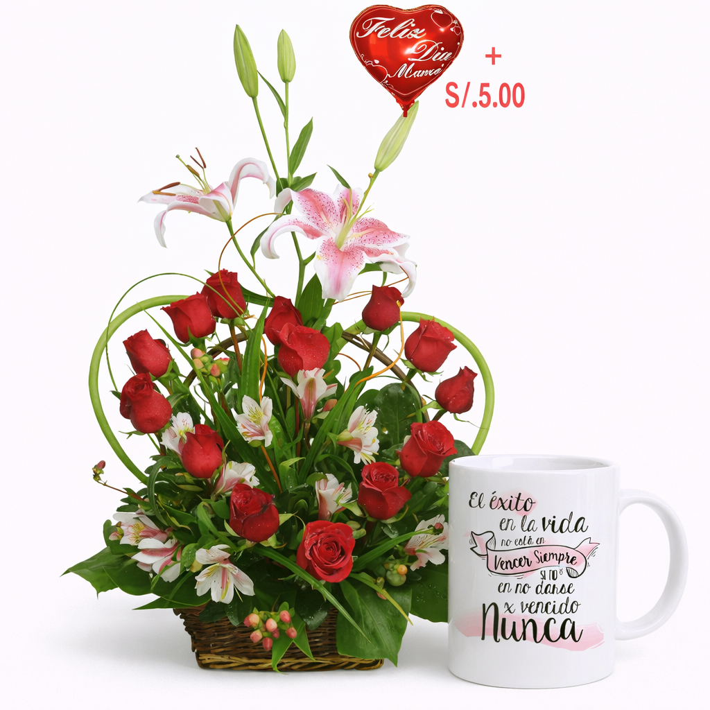 Hermoso arreglo floral ideal para expresar amor y ternura. Contiene 4 rosas rojas importadas, 10 claveles rosados importados, follaje fino natural, acompañado de 1 globo en forma de corazón (según disponibilidad) y un delicioso chocolate Ferrero Rocher. Todo presentado con encanto en una canasta de mimbre decorada.
