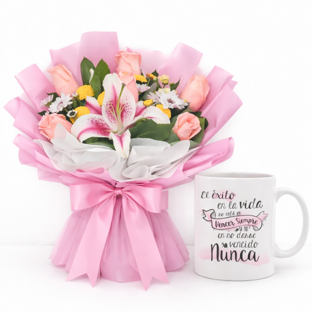 Elaborado con seis rosas rojas que aportan elegancia y romanticismo, acompañado de un lilium rosado que brinda un toque de frescura y distinción. Se complementa con delicados toques de flores silvestres y se presenta con una envoltura especial que realza su estilo natural y armonioso.