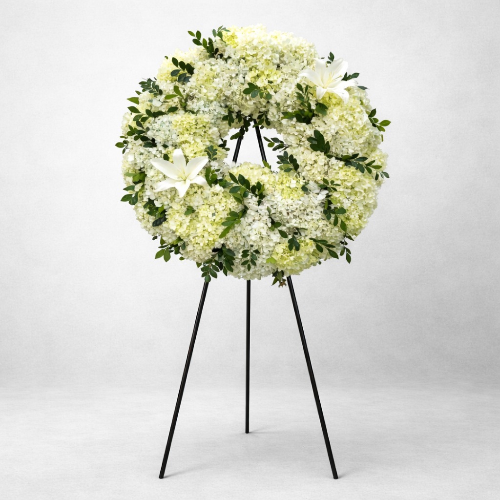 Esta hermosa corona floral ha sido elaborada como un homenaje lleno de serenidad y elegancia.