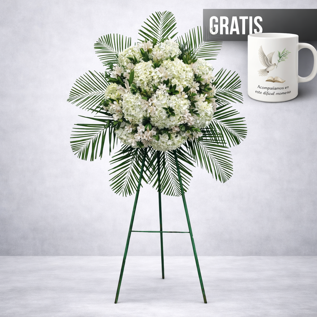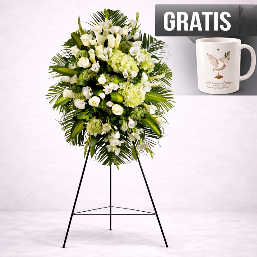 Nuestra Corona Floral de Homenaje, de aproximadamente 1.80 metros de altura, está compuesta por lilium aromático blanco, rosas, astromelias, iris, hortensias y follaje fino. Cada flor ha sido dispuesta con esmero para crear una composición armoniosa que transmite respeto, serenidad y belleza. Su presencia elegante la convierte en un tributo digno para momentos de despedida.