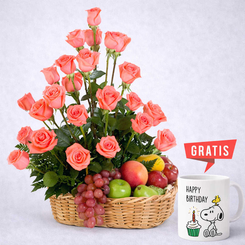 Hermoso arreglo floral presentado en una fina canasta, elaborado con 30 rosas rojas importadas, acompañado de 2 globos en forma de corazón y 1 globo de cumpleaños, además de un tierno peluche y follaje fino. Un detalle perfecto para sorprender con amor, alegría y un toque especial en cualquier ocasión.